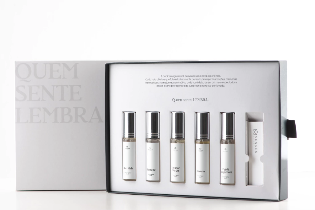 O Kit Experiência Senses foi desenvolvido para facilitar o processo de escolha da fragrância ideal para aromatização de ambientes. Contém 5 amostras olfativas, com diferentes perfis aromáticos, permitindo uma avaliação sensorial prática e comparativa.